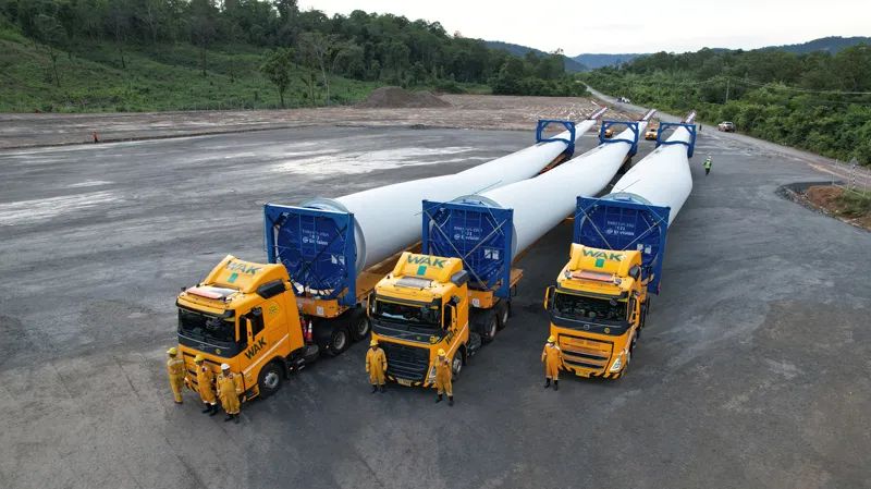 老挝孟松风电项目首批12台风机设备于7月23日在中国常熟港发运,历经2289海里的海上运输,于7月31日靠港卸船,在8月7日安全完成卸船后,又历经1225公里的公路运输抵达项目现场。