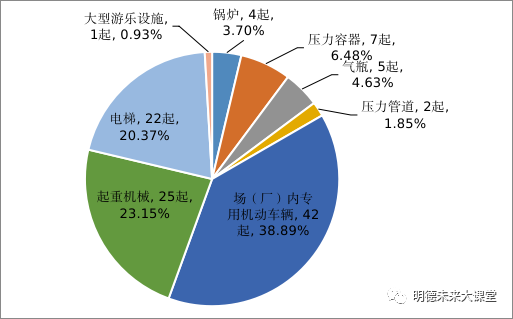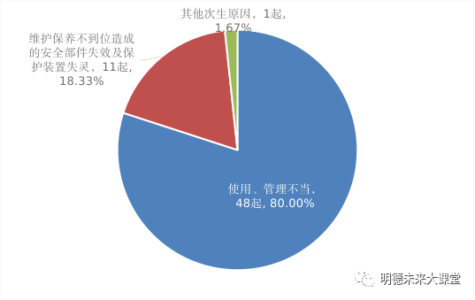 4. 电梯事故。安全管理、维护保养不到位2起,违章作业或操作不当4起,主要部件失效或安全保护装置失灵等原因6起,应急救援不当1起。
