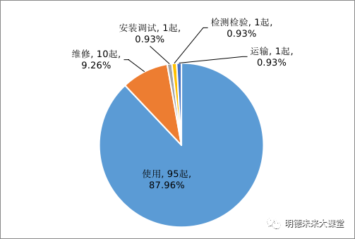 按发生环节划分,发生在使用环节95起,占87.96%,维修环节10起,占9.26%,安装调试环节1起,占0.93%,检验检测环节1起,占0.93%。运输环节1起,占0.93%。(见图5)