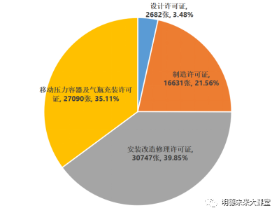 截至2022年年底,全国共有特种设备生产(含设计、制造、安装、改造、修理)和充装单位75689家,持有许可证77150张,其中:设计许可证2682张,制造许可证16631张,安装改造修理许可证30747张,移动式压力容器及气瓶充装许可证27090张。(见图2)