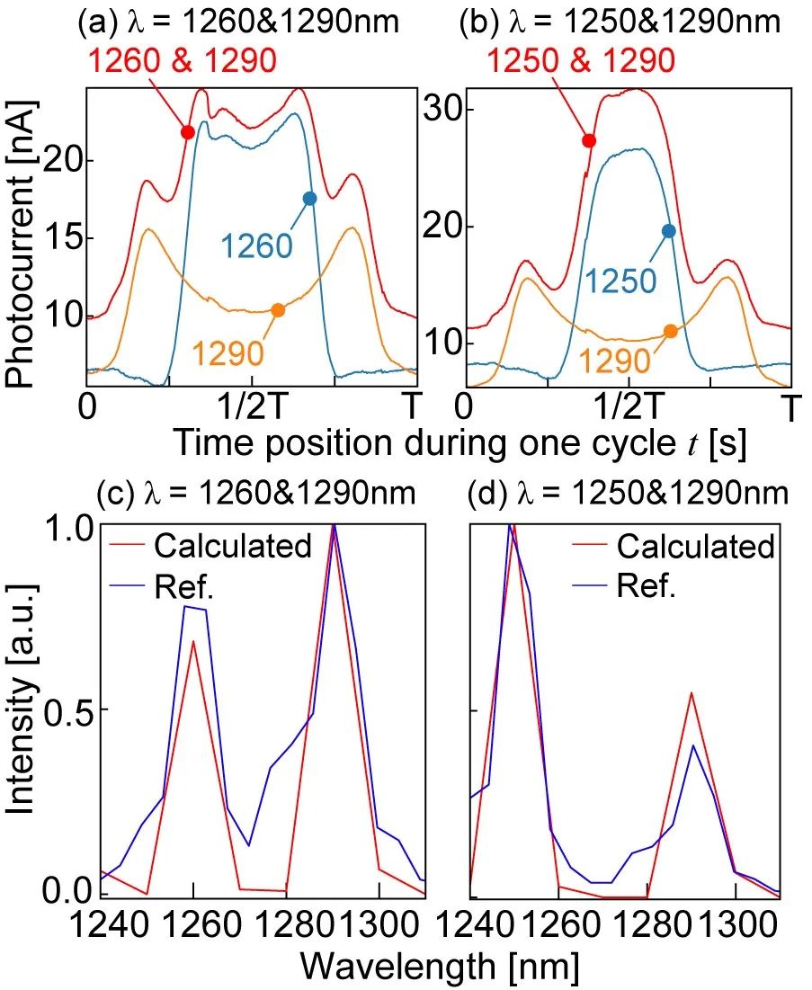 图3: 光谱学示范。(a), (b)光谱学测量的光电流信号,由红线所示的两个单色波长照射产生。橙色和蓝色线表示单色照射下的光电流信号。每个波长在对应的图上以纳米为单位显示。(c), (d)由光电探测器获得的光电流信号所得到的光谱和位移电流的去除方法。红线表示文章方法的光谱;蓝线显示从参考近红外光谱仪(Sol2.2A, BWTEK, usa)获得的结果。