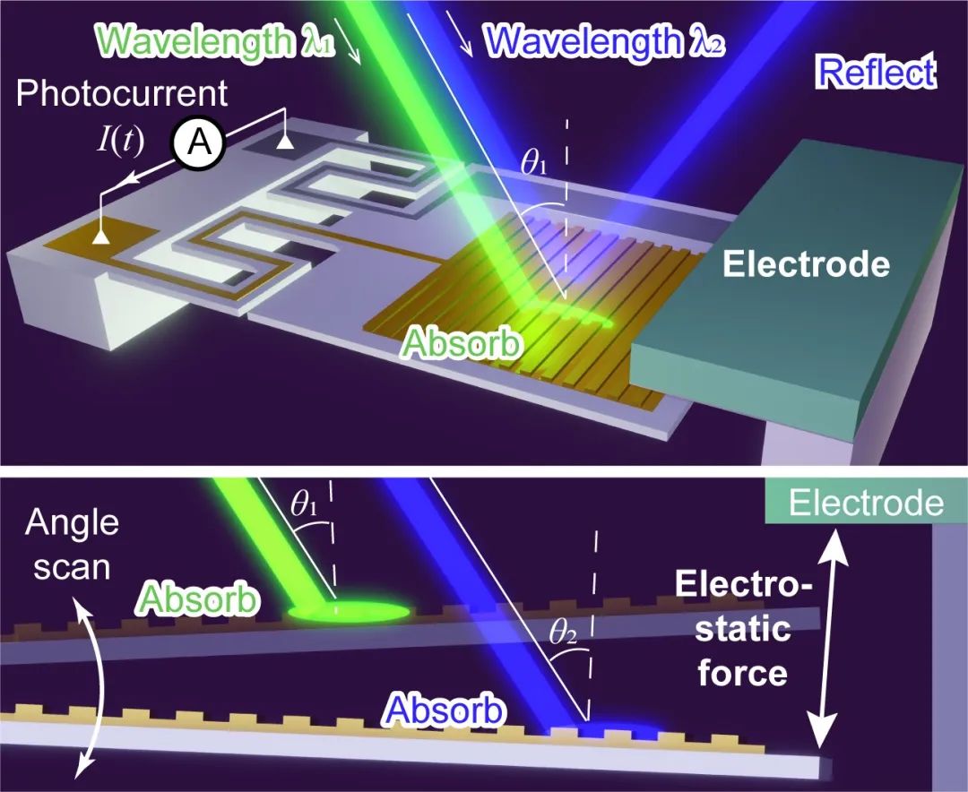 为了获得独特的峰值位移,作者提出了一种等离子体光电探测器,它用机电变形而不是偏置调谐来重新配置其光谱响应。本研究中的光电探测器由一个n型硅悬臂梁组成,其表面形成一个等离子体金衍射光栅,并在其旁边放置一个电极。电极位于悬臂上方,通过在电极和悬臂之间施加电压产生静电力。静电力使悬臂梁共振,并在光入射角处重新配置等离子共振态。采用双之字形悬臂脚来降低刚度,提高扫描入射角振幅。当特定波长的入射光以相应的角度进入时,表面等离子体共振(SPR)发生并吸收入射光。SPR吸收的光为光栅上的金电子提供了能量,激发的电子跳过了金和n型硅之间的能量势垒,称为肖特基势垒。作者检测特定波长的入射光,以测量这些电子作为通过阳极和阴极的光电流。由于静电力使入射角振动,光电探测器的探测波长被周期性地扫描。在作者的研究中,由于机电重构,在室温下,在1250 ~ 1310 nm波长范围内观察到系统的峰移,这与以往的研究有显著差异。该结构具有在工业硅成像系统中作为近红外光谱仪的潜力,因为该结构还可以通过肖特基结在硅上实现亚带隙光检测。该研究还表明了等离子体光电探测器与其他静电驱动微机械结构集成的可能性。这项技术扩大了未来等离子体光电探测器的应用范围。