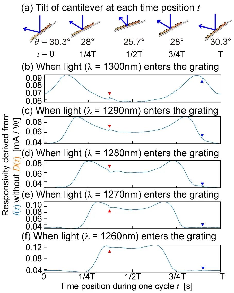 作者测量了光电探测器的响应,其中排除了由静电驱动产生的位移电流的贡献。光电探测器的响应度如图5(b)-(f)所示。图5(a)显示了在0、1/4T、1/2T、3/4T、T周期内,本实验悬臂在时间位置的扫描角度,图5(b)-(f)显示的信号清楚地显示了位移电流的消除。在扫描角25.7°到30.3°对应的1/2T 到T的时间范围内,图5(b)-(f)所示响应度峰值处的入射角随着入射光波长的增加而增大,且这些峰值移位与旋转阶段的实验一致。然后,作者得出结论,利用位移电流消除方法,光电探测器的光电流测量可以在机电重构过程中进行。在图5(b)-(f)中,一个轻微的类似缺口的工件显示在3/8T(由红色三角形表示)和7/8T(由蓝色三角形表示)。位移电流信号和AWG信号之间的小滞后或误差可能会导致这些伪影。延迟或误差可以通过提高AWG的时间和电压分辨率或通过仔细的手动调整来减少。