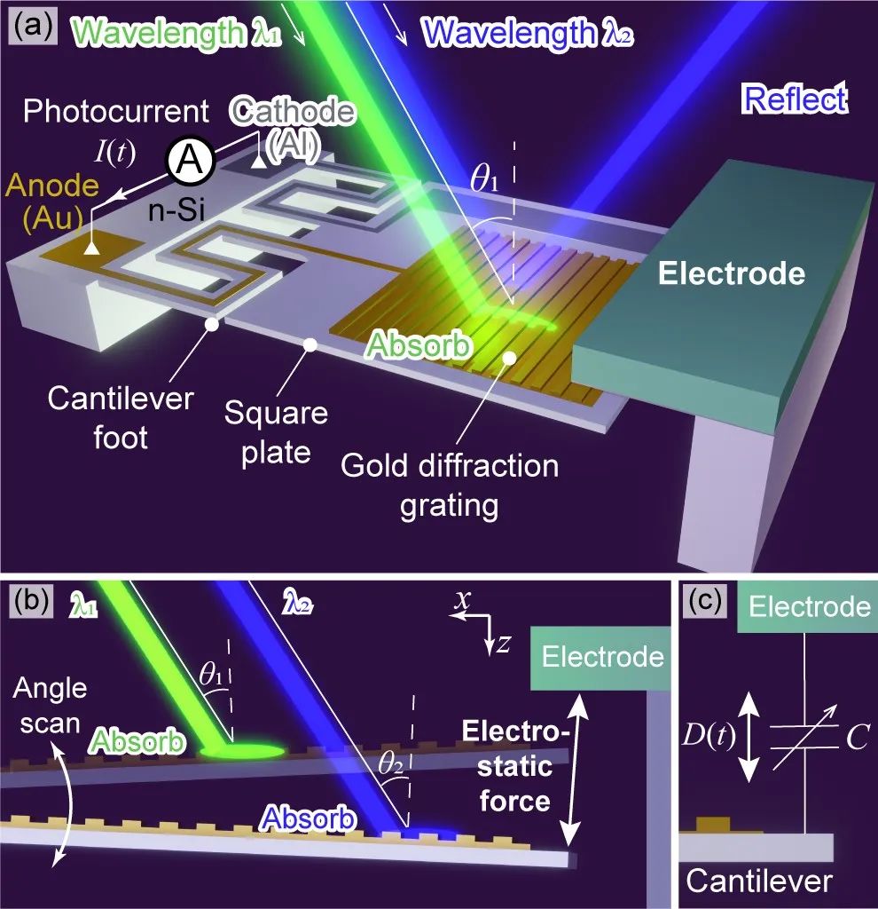 本研究中的光电探测器由一个n型硅悬臂梁组成,其表面形成一个等离子体金衍射光栅,旁边放置一个电极(图1(a))。电极位于悬臂上方(图1(b)),通过在电极和悬臂之间施加电压产生静电力。静电力使悬臂梁共振,并在光入射角处重新配置等离子共振态。采用双之字形悬臂脚来降低刚度,提高扫描入射角振幅。当特定波长的入射光以相应的角度进入时,表面等离子体共振(SPR)发生并吸收入射光。SPR吸收的光为光栅上的金电子提供了能量,激发的电子跳过了金和n型硅之间的能量势垒,称为肖特基势垒。作者检测特定波长的入射光,以测量这些电子作为通过阳极和阴极的光电流。由于静电力使入射角振动,光电探测器的探测波长被周期性地扫描。研究中,由于机电重构,在室温下,在1250到1310 nm的波长范围内观察到系统的峰移位。
