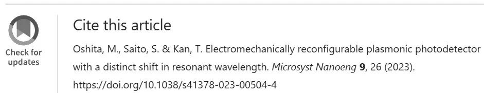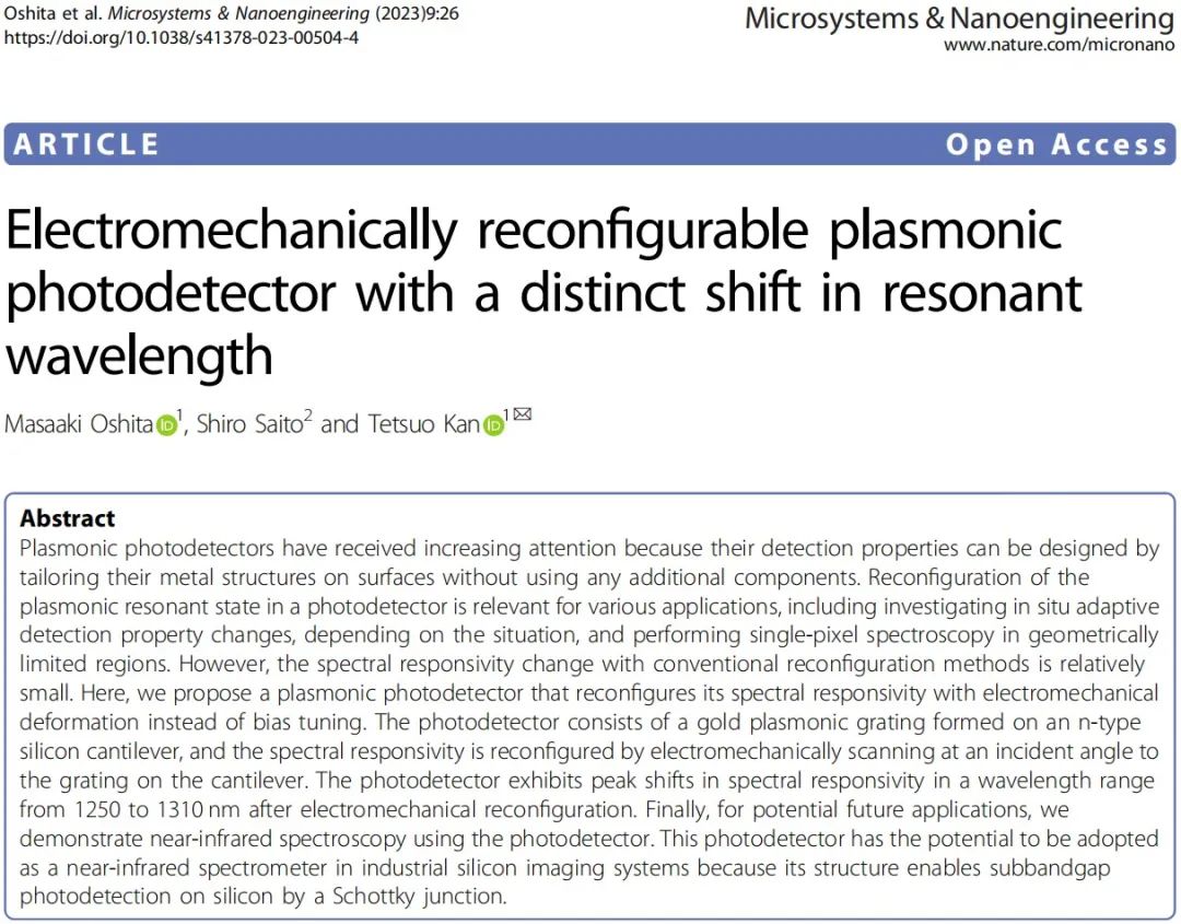 电气通信大学Tetsuo Kan教授团队提出了一种等离子体光电探测器,可以通过机电变形而不是偏置调整来重新配置其光谱响应。经过机电重新配置后,光电探测器在 1250 纳米到 1310 纳米的波长范围内显示出峰移。