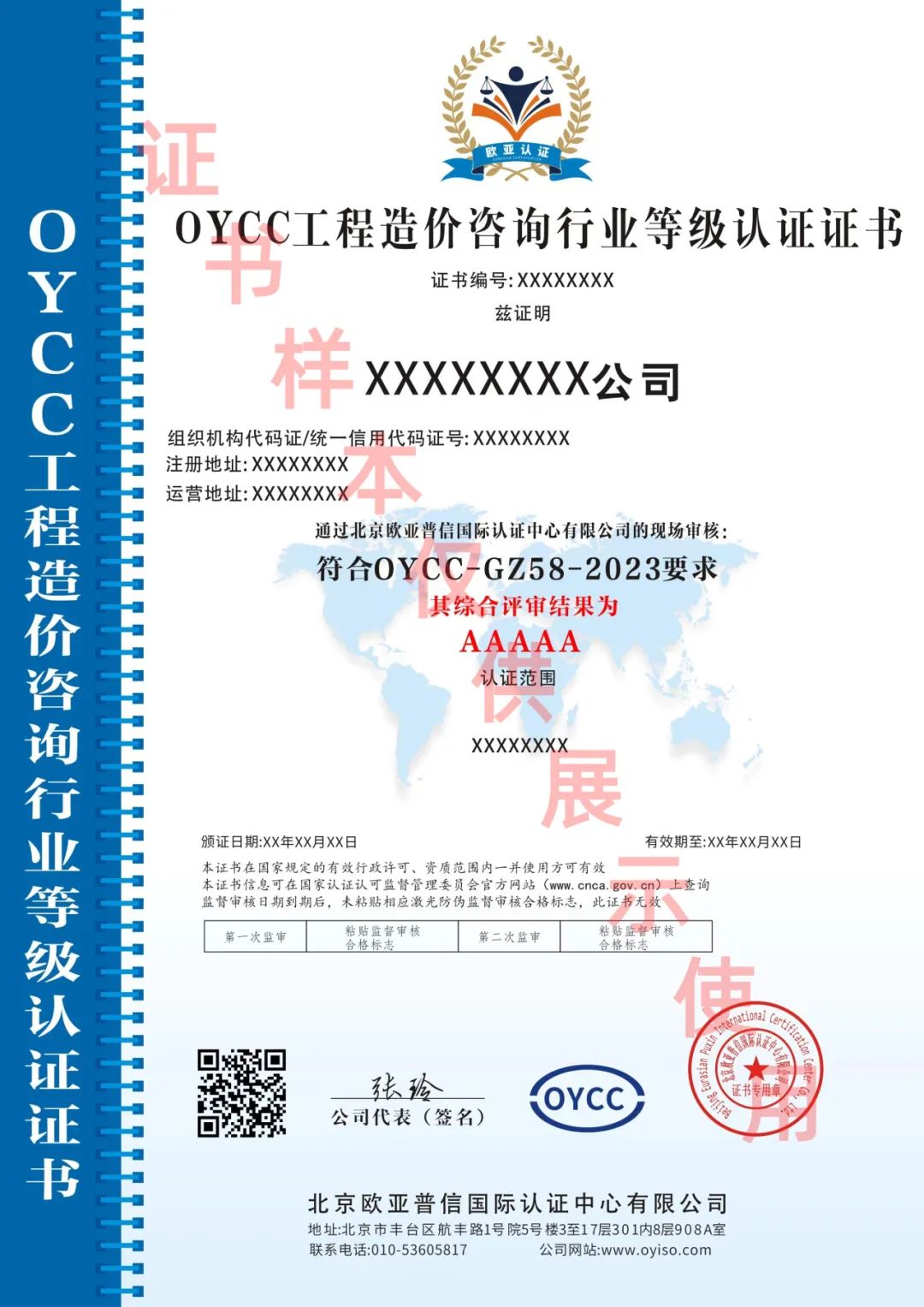 工程造价咨询体系认证证书,此认证是第三方权威认证机构参照GB/T 51095-2015、CCCH1001-2020相关技术标准,对企业、机构保密制度、鉴定流程、管理制度、鉴定回避制度、档案管理制度、鉴定流程、依据、各项通知书、勘察笔录、图表、异议处理制度、流程、过程记录等等进行评价,针对企业相关项的管理特性和服务特性给予综合评定,最终给审核评价通过的企业颁发相应等级的证书,证书分为5A级、4A级、3A级。