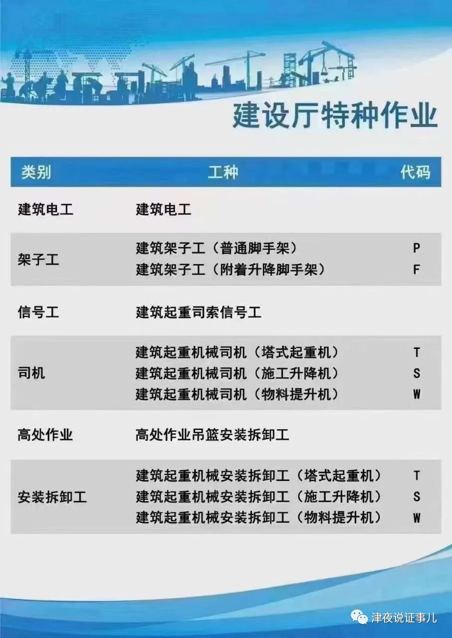 建设厅特种作业工种有建筑电工、建筑架子工、建筑起重信号司索工、建筑起重机械司机、建筑起重机械安装拆卸工、高处作业吊篮安装拆卸工等。