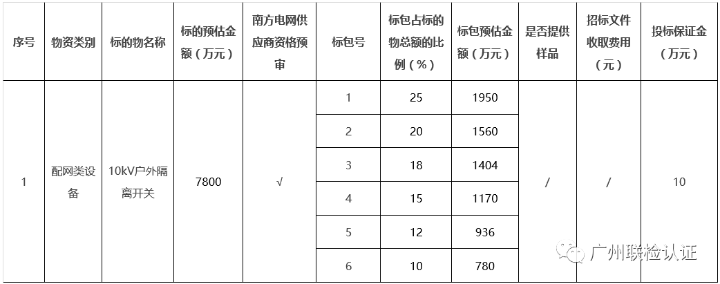 广东电网公司2023年第二批框架招标(10kV户外隔离开关)招标公告