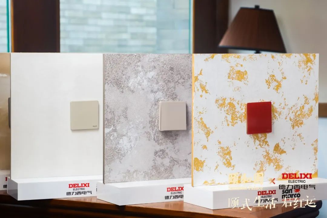 为了直观感受这种色彩碰撞的魅力,德力西电气品牌总监王策与圣马可集团中国区技术总监包立民挑选“开门红系列”、“岩彩系列”和“御彩系列珠光白”三款产品与墙板的结合,生动展现不同品类,不同文化间碰撞的奇妙火花。
