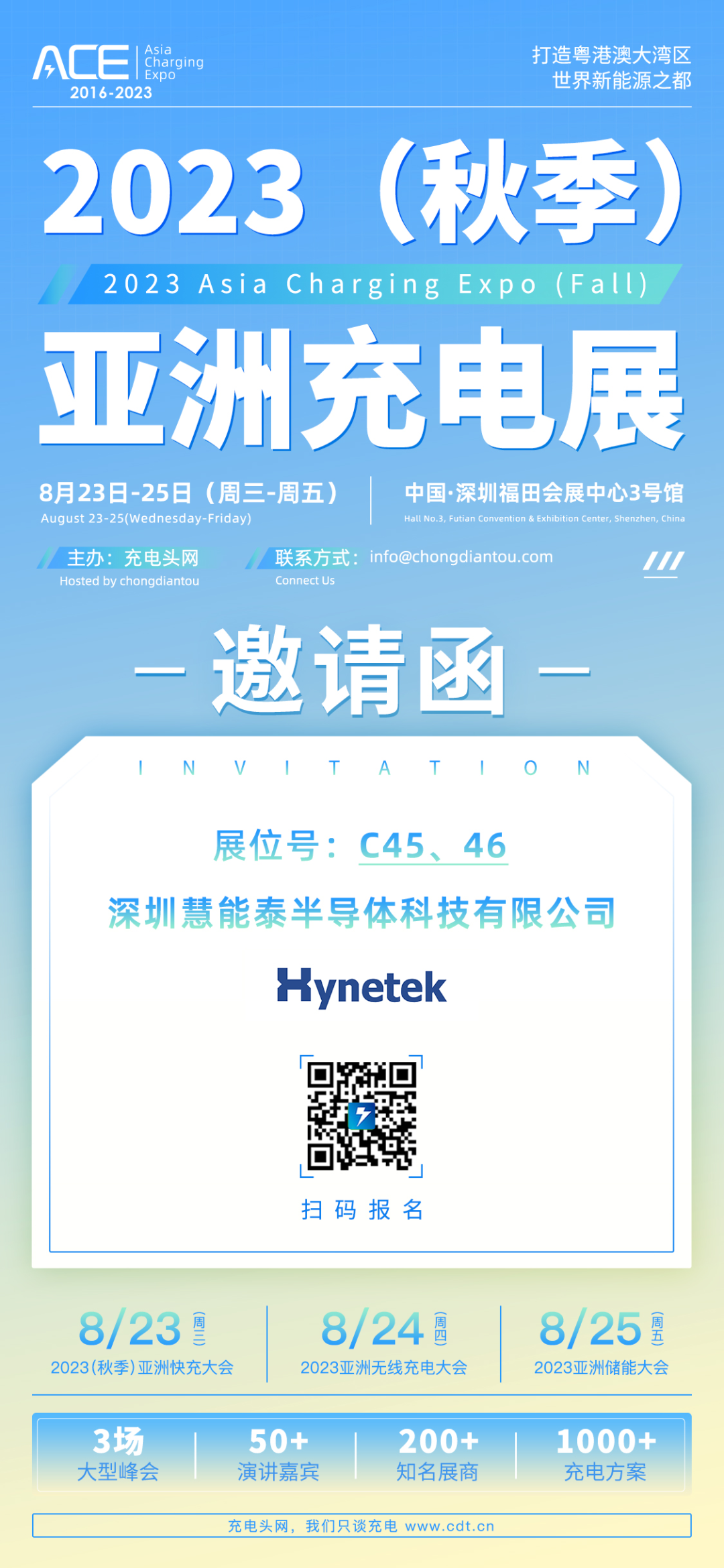 2023(秋季)亚洲充电展(Asia Charging Expo,简称ACE)将于8月23日-25日在深圳福田会展中心3号馆举办。慧能泰半导体受邀参加此次展会,将集中展示旗下多款USB PD新品,展品覆盖USB Type-C&PD整个生态链,一站式解决供电端、设备端、线缆端的USB Type-C&PD设计问题。诚邀大家莅临参观。