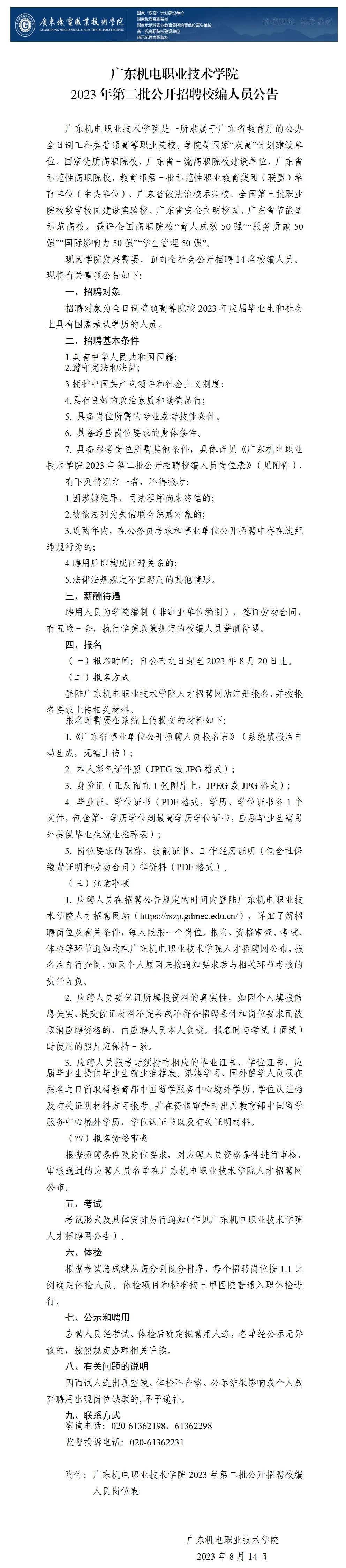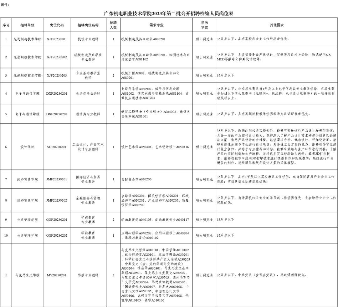 广东机电职业技术学院2023年第二批公开招聘校编人员公告