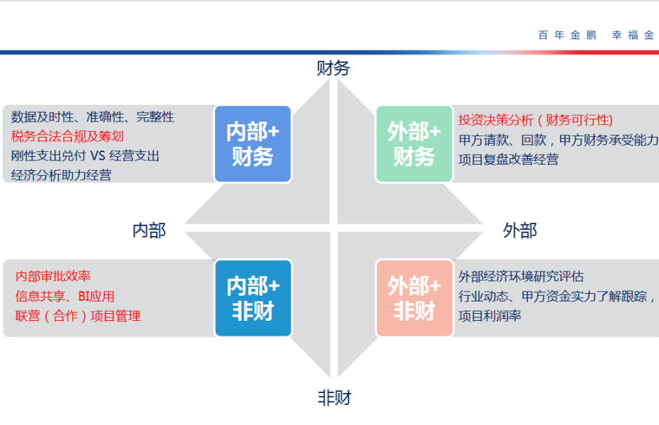 金鹏建设业财负责人张丛萍从经营决策、降本增效、BI应用,联营管理四个维度解读建设板块业财工作概况。业财工作要做好事前分析决策,着力降本增效,推广BI应用,提升运转效率。