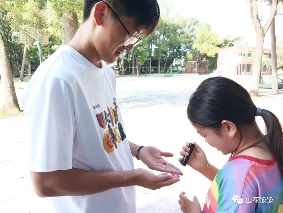 看!原来那些发着光的小亮点是平时我们肉眼看不见的“细菌”!让同学知道手上有细菌后,老师在旁边讲述七步洗手法,让同学们知道如何才能把小手洗干净。
