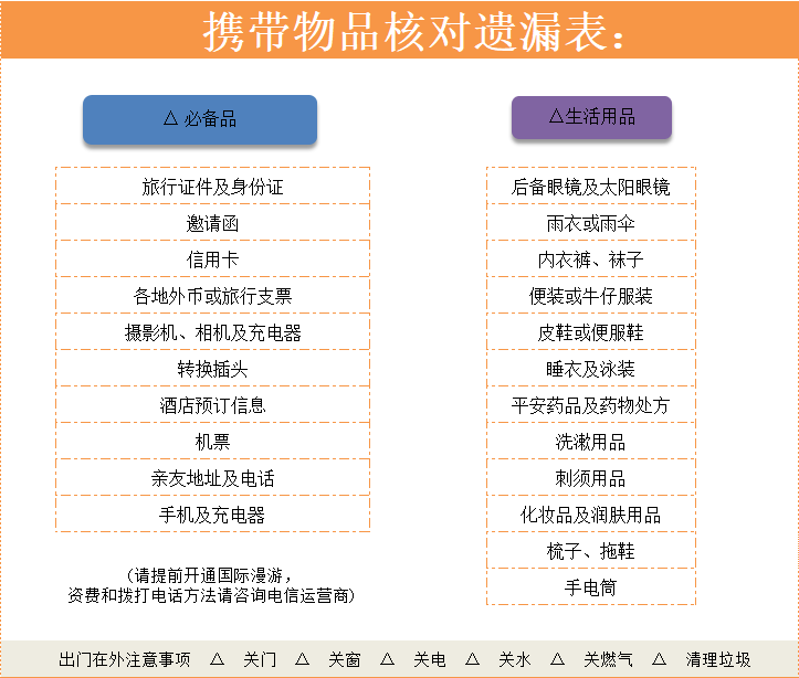 注:出行之前需提前开通国际漫游,以便对外联络。