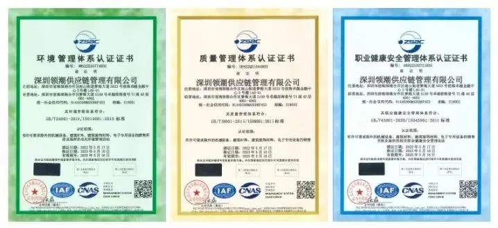 领潮供应链为行业首家获ISO9001、ISO14001、ISO45001