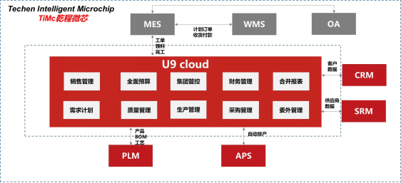 智能工厂的运作离不开乾程的TiMc(Techen Intelligent Microchip 乾程微芯),而TiMc的基础集成平台就是 U9 cloud。U9 cloud将各个大而分的业务管控系统整合在了一起,完成了一体化应用,让乾程把业务管控完全搬到了线上,为业务的全“数智化”打好了基础。