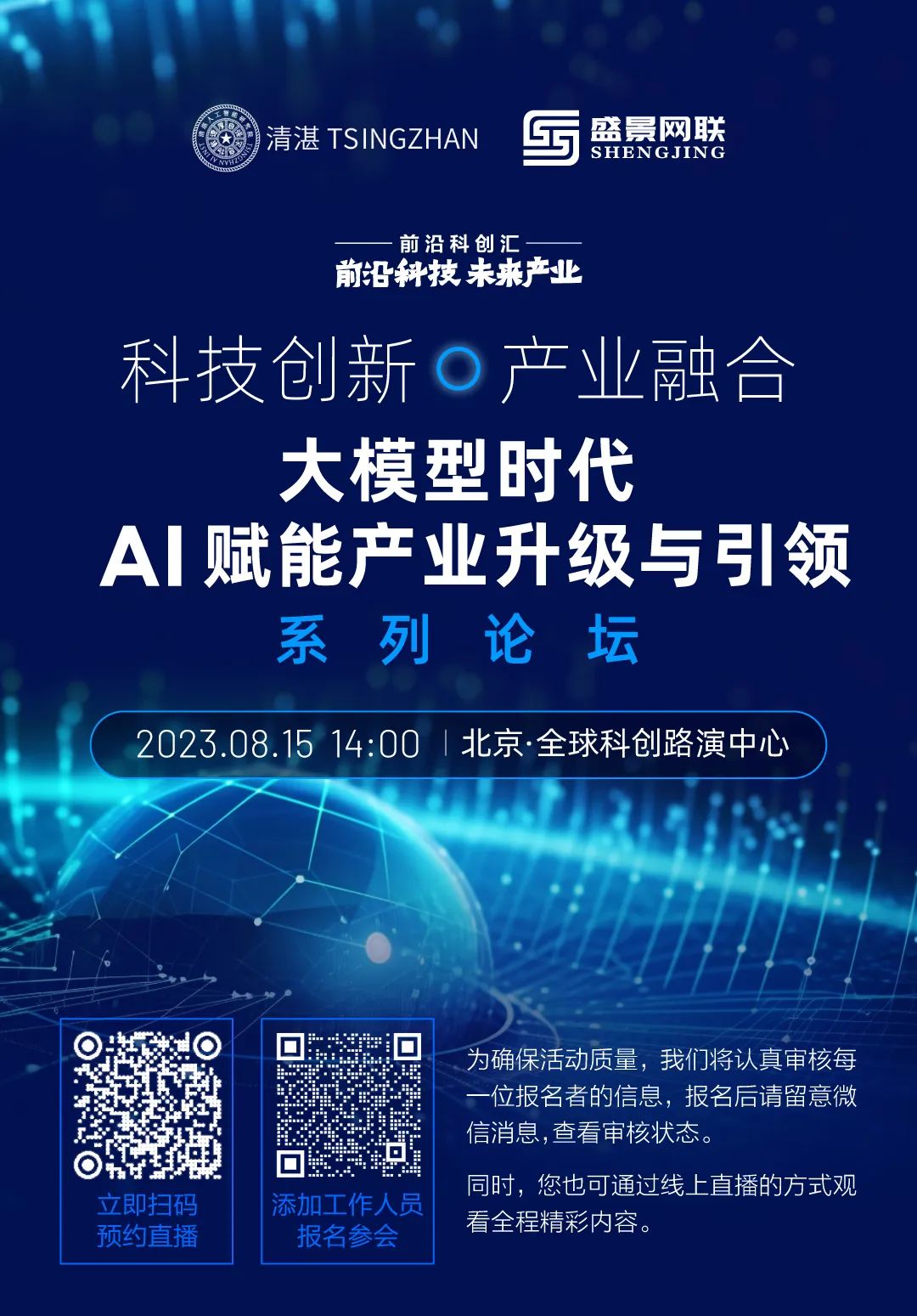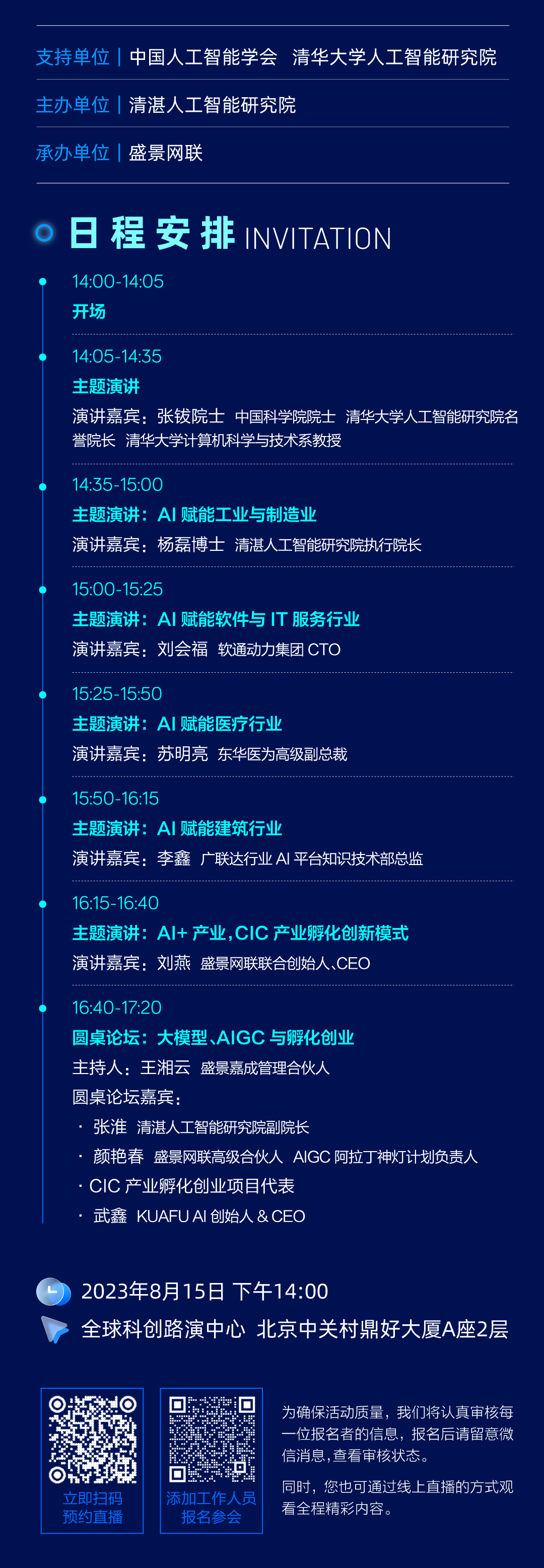 社会声量从科创前沿,泛起在大众狂欢,以ChatGPT为代表的生成式AI,在完成教育市场、塑造认知后,热度逐渐褪去。行业逐渐达成共识,大模型的竞争,关键不在技术,而在产业场景落地。要从产业中来,到产业中去,服务产业需求。于是IT行业、工业与制造业、互联网与媒体、医疗行业、建筑行业、金融法律财税等专业服务领域……各个行业大模型如雨后春笋般出现在世人面前,让“大模型”这个几个月前还显得有些缥缈的新事物拥有了落地的根基,展现了“AI赋能千行百业”的潜力。面向未来,大模型时代,根本价值就是重构生产力模式,并且为人工智能的产业落地带来范式革新。而人工智能的发展,关键是要“走深向实”,赋能产业升级。传统行业如何应对新一轮AI浪潮?AI如何帮助企业降本增效?企业如何利用大模型重塑业务?在中国人工智能学会和清华人工智能研究院的大力支持下,由清湛人工智能研究院发起并主办,由盛景网联承办的《大模型时代,AI赋能产业升级与引领》系列论坛将于8月15日举办。本次论坛特邀清华大学人工智能学科的奠基人,中国科学院院士、清华大学人工智能研究院名誉院长张钹院士莅临并做重磅分享。我们还将邀请专家学者、企业、协会、资本、媒体共聚一堂,以期促进产业上下游交流、助力产业创新与升级。8月15日,北京中关村全球科创路演中心,我们不见不散!