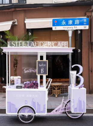 活动中,上海网红咖啡街成了雅诗兰黛的“紫色”海洋,熊爪咖啡快闪店、街头咖啡车、创意物料,永康路被包场打造成了可以用来沉浸式体验品牌与商户的场景。