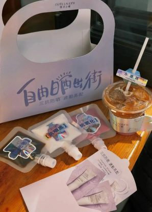 值得一提的是,雅诗兰黛与咖啡商户的合同不仅仅是单纯围绕品牌冠名和包装设计展开,而是形成了“茶咖创意DIY”,即将品牌产品的抗晒、抗氧、抗光老一体的“三抗”化身成为咖啡商户的“三料特调”,分别对应 果汁、奶、咖三种原料,让到场用户在根据喜好调制出独特风味咖啡的过程中自然加深了对品牌和产品的了解。