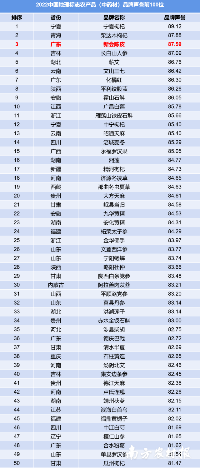 近日,“2022中国地理标志农产品(中药材)品牌声誉前100位”正式公布,其中,新会陈皮以87.59的品牌声誉值,高居全国第3位,与2021年的第8位相比有了显著提高。此外,广东共有6个中药材入选该榜单,新会陈皮(第3位)领衔,其余分别为化橘红(第7位)、德庆巴戟(第36位)、合水粉葛(第48位)、德庆何首乌(第56位)、高要巴戟天(第61位)。