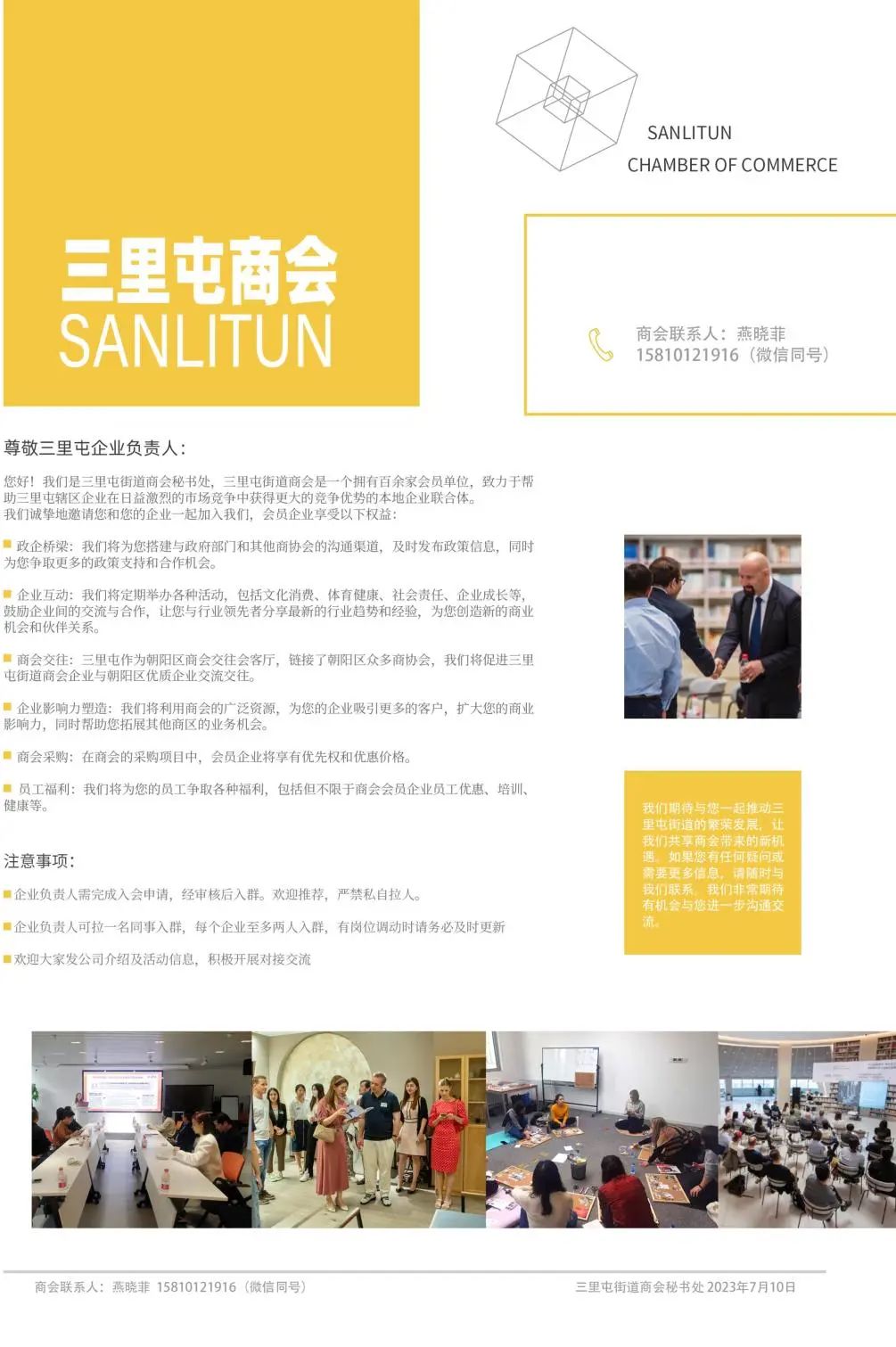 三里屯街道商会“企业成长沙龙”旨在为“会员”企业赋能,促进三里屯企业家之间的学习、交流和资源共享,推动企业的发展。通过定期举办“成长沙龙”系列活动,商会提供了让企业家们分享经验、交流思想的平台,了解其他企业经营理念和行业资源的机会,激发创新思维,了解行业的前沿知识和技术,并从其他成功案例中获取灵感和启示。“成长沙龙”系列活动将助力企业建立更广泛的人脉和合作关系,扩大业务网络,创造商业机会和合作伙伴关系,提升会员企业竞争力,共同促进会员企业的成长和发展,推动三里屯经济的繁荣和进步。
