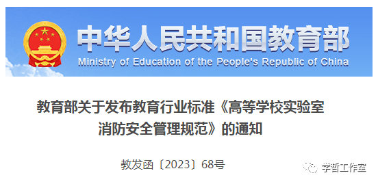 为深入贯彻落实党的二十大精神,进一步规范高等学校实验室消防安全管理,预防火灾事故发生,维护学校安全稳定,教育部研究制定了《高等学校实验室消防安全管理规范》。经全国教育装备标准化技术委员会审查通过,现作为教育行业标准予以发布。该标准自发布之日起实施,请结合实际认真贯彻执行。