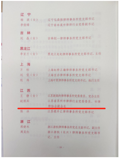 赵雨兵,现任苏州市律师行业党委委员、苏州市律师协会副会长,昆山市律师协会会长。自2002年从事律师执业以来,坚持党的领导,政治信念坚定,始终将“以人民为中心”贯彻在每一起案件办理过程中,以实际行动,践行了委托方权利的维护者、矛盾纠纷的化解者、法治建设的推动者和法治化营商环境的建设者职责。同时在党务工作和律师管理工作中以身作则、以上率下、求真务实、勇于担当,结合行业特点,探索行业党建工作先进方法,直面困难,破解难题,为推动地方经济高质量发展贡献力量。曾荣获昆山市司法行政系统“名律师”、苏州市五一劳动奖章、江苏省律师行业优秀党员律师、江苏省司法厅“双促双助”先进个人等称号。