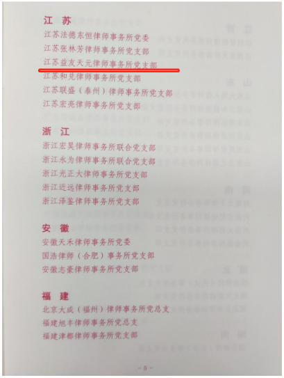 江苏益友天元律师事务所党支部成立于2012年9月,是苏州市律师行业成立较早的党支部,现有中共党员35人,约占事务所苏州总部律师总人数的45%。近年来,支部不断增强政治功能和组织功能,发挥基层战斗堡垒作用,坚持以党建引领所建,引导律师依法依规诚信执业,积极履行社会责任。曾荣获苏州市优秀律师事务所、江苏省律师行业先进基层党组织、全国优秀律师事务所等称号,支部“益知海棠、红满苏城”项目获得江苏省律师行业基层党建工作创新项目奖。