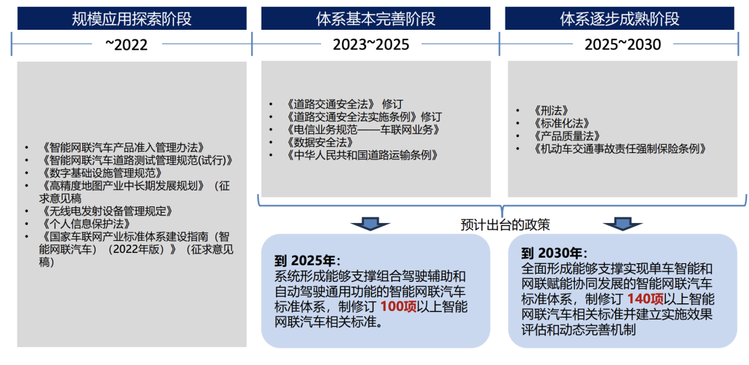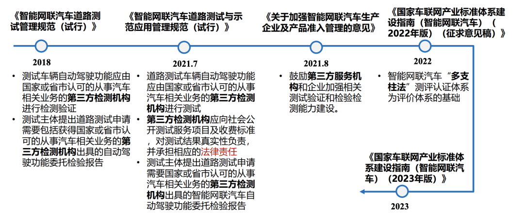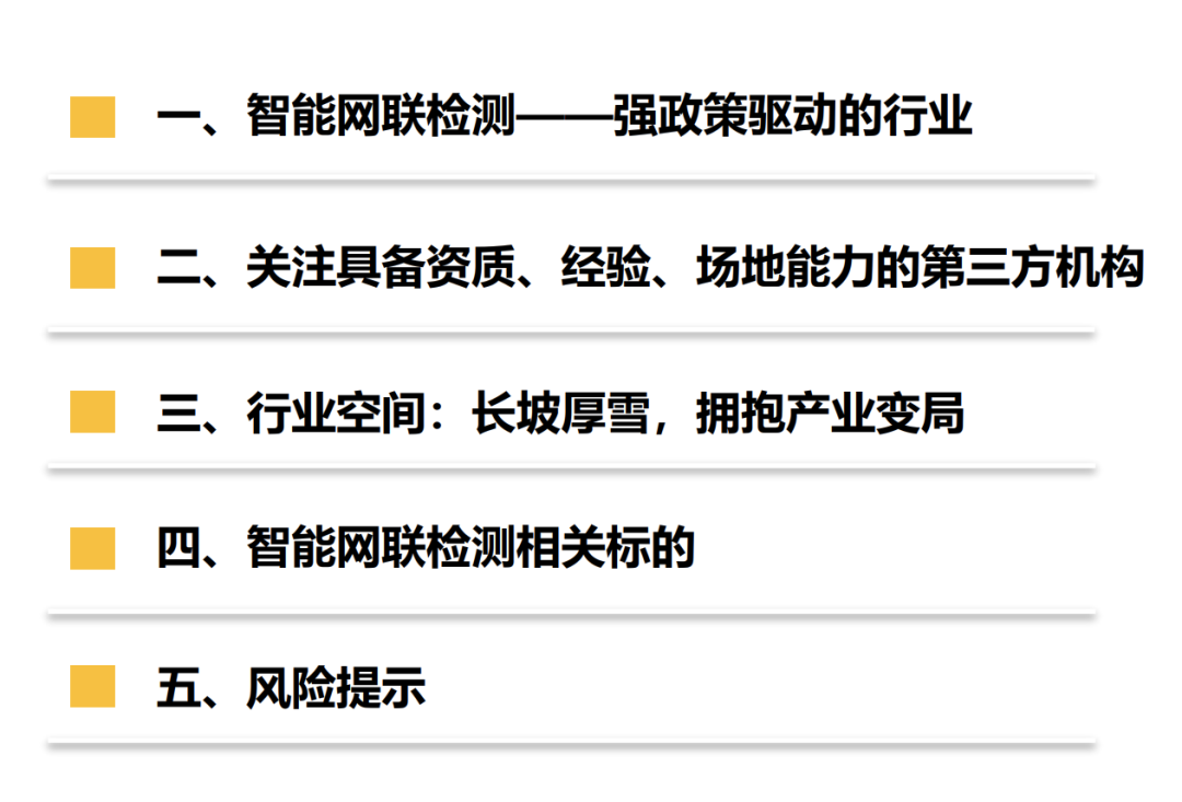 产业端AI智能化驱动汽车行业高阶自动驾驶加速落地,政策端近年来工信部等组织推出数条智能网联相关政策,我国步入智能网联商用化体系建设关键阶段。不同于L2级别自动驾驶时期驾驶员承担几乎所有的车辆行驶责任,L3级别自动驾驶将划分多方主体的责任,更需要强制性政策来配合高阶自动驾驶落地。智能网联检测作为汽车智能化能力的重要评判标准有望从非强制走向强制端,行业处于产业变革前夕