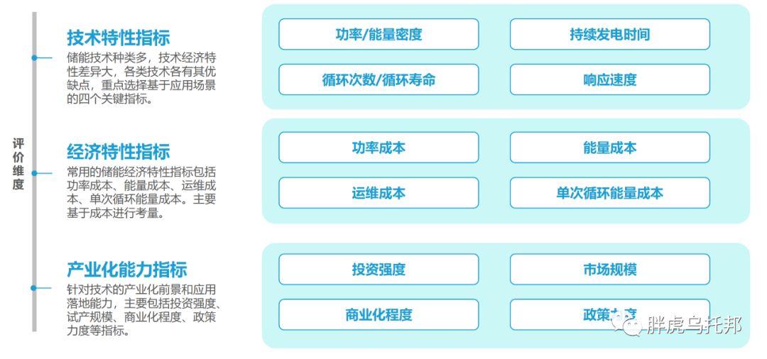 我们简单总结下储能的技术发展和落地应用评价指标,从上面内容我们大体可以总结出,储能评价指标主要是围绕着三个维度进行展开,一个是技术特性,主要围绕功率或能量密度、持续发电时间、循环次数和循环寿命,以及响应速度来进行评价。第二个是经济特性,主要围绕功率成本、能量成本、运维成本和单次循环能量成本来进行评价。第三个是产业化能力,主要是从投资强度,市场规模,商业化程度,政策力度等方面进行评价。综合上述内容,我们可以画出整个指标体系。