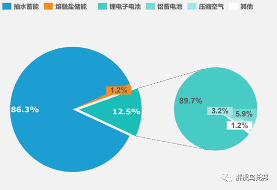 但一般我们谈及储能,都是指的储电,从目前市场的技术分类来看,可分为机械储能、电化学储能和电磁储能。机械储能一般包括抽水储能,压缩空气储能、飞轮储能,都是以做工的方式来进行能量逆反的存储。电化学储能主要是指电池储能,这块根据电池类型的不同,也有细致的划分,如锂离子电池,铅酸电池,钠硫电池等。电磁储能则就比较高级了,目前的技术方向主要是