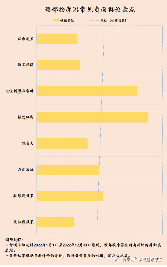 颈部按摩器有用不?为了避免购买低质量的颈部按摩器导致伤颈问题,我们需要注意以下四种行业的黑幕。从下图的按摩器全网负面语舆论统计可以清楚地看出,肌肉受伤是投票数量最多的问题。这是因为市场上存在大量劣质的按摩器,因此我们必须警惕,这些黑幕是导致肌肉受伤的原因,让我们一起来了解一下吧!