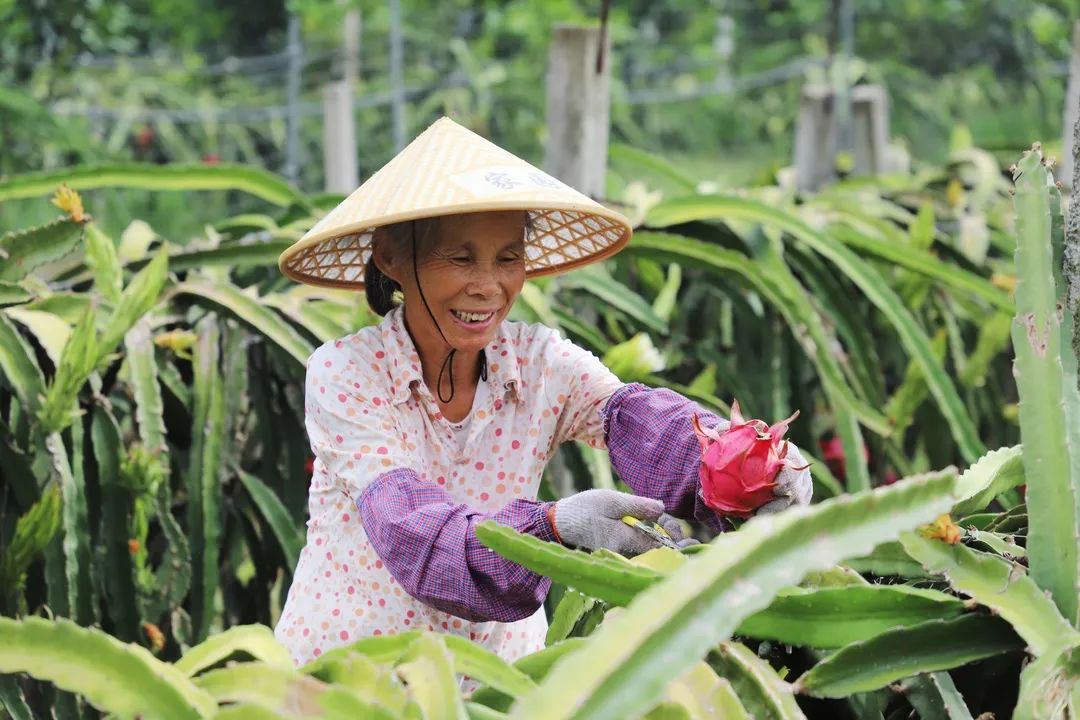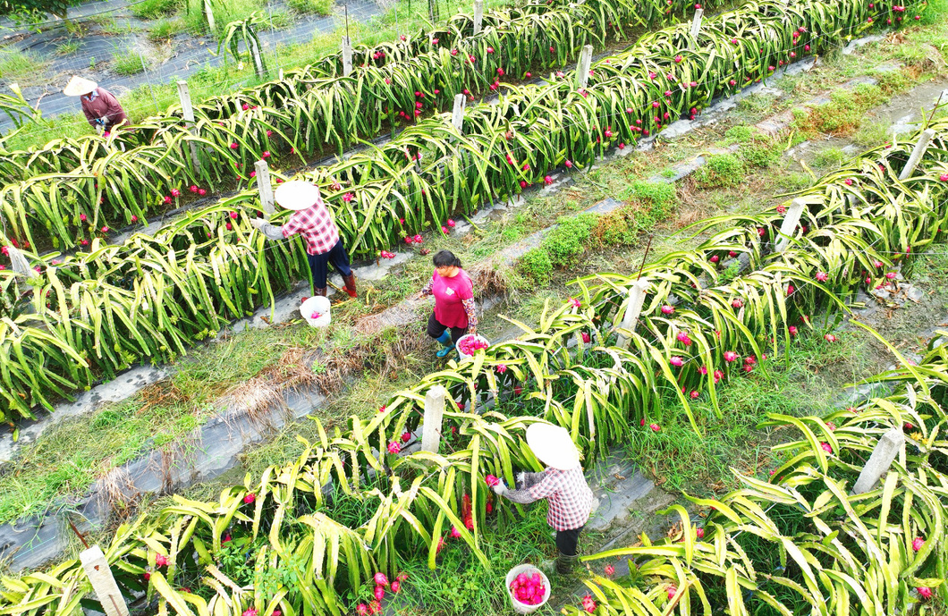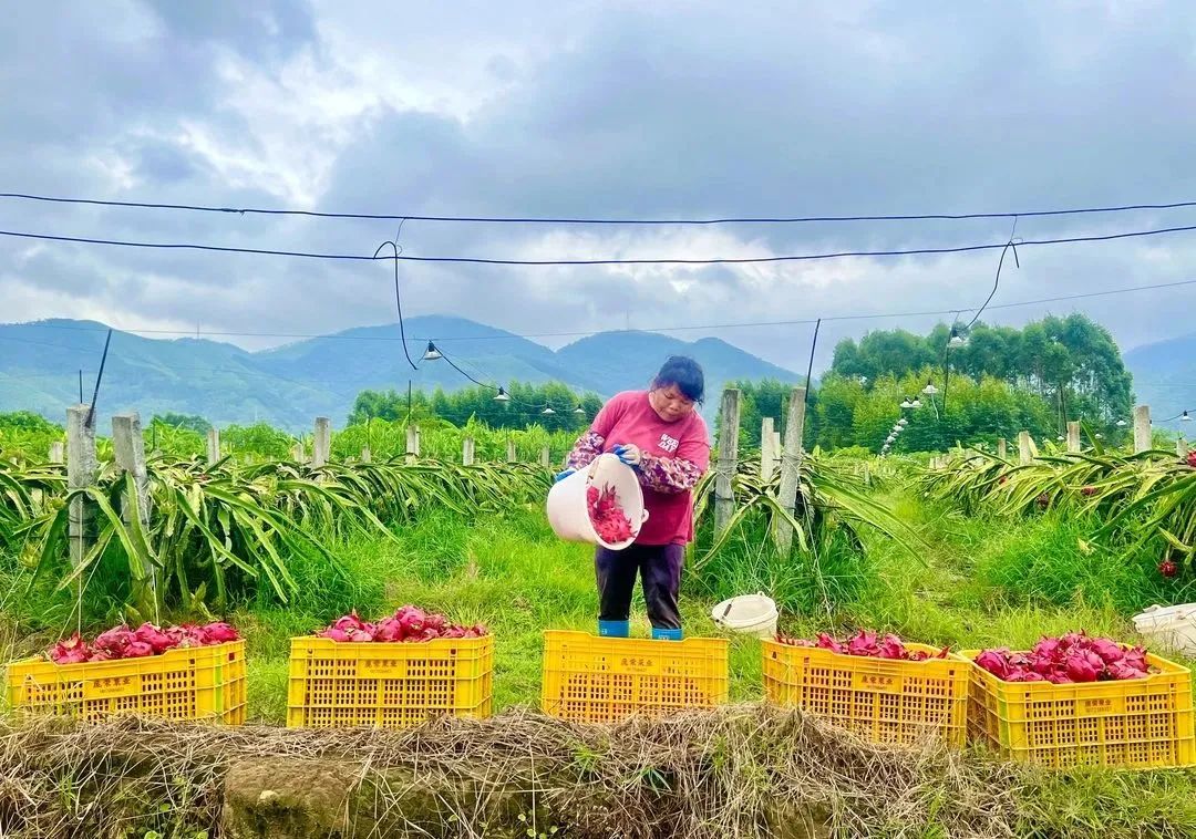 “这批火龙果长得真好啊,这一季又丰收啦!”在玉林市兴业县石南镇东山火龙果基地示范区里,一颗颗紫红色的火龙果挂满枝头,色泽鲜艳、果形饱满,让人垂涎欲滴,果农们拿着一个个箩筐,正忙着采收成熟的果实,不时传来一阵阵欢乐的笑声,丰收的喜悦溢满了整个果园。