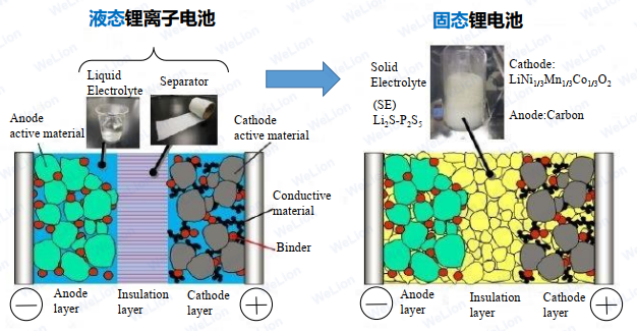 传统锂离子电池包括正极、负极、电解液、隔膜四大组成部分,固态电池将电解液换成固态电解质。固态电池较之传统锂离子电池,关键区别在于电解质由液体变为固体,兼顾安全性、高能量密度等性能。