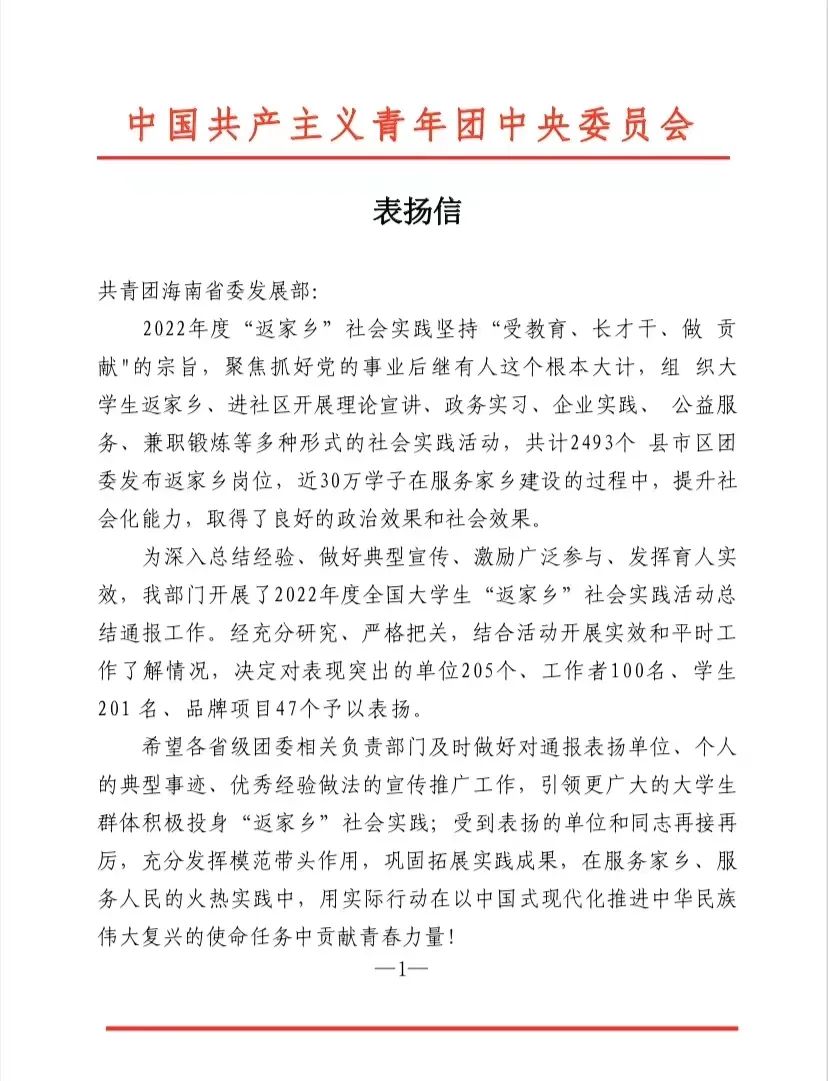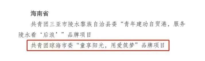 近日,共青团中央对2022年度“返家乡”社会实践工作下发了表扬信,共青团琼海市委“童享阳光,用爱筑梦”品牌项目荣获表扬。