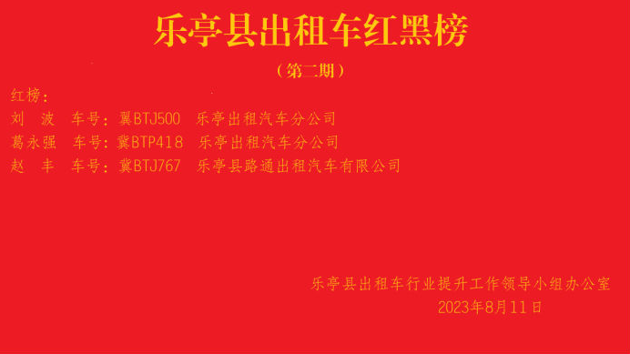 按照出租汽车行业“三争一打造”活动安排,乐亭县出租汽车行业提升行动领导小组办公室根据服务质量、司机事迹等情况,通过综合评定,确定并公布出租车司机“红黑榜”名单。