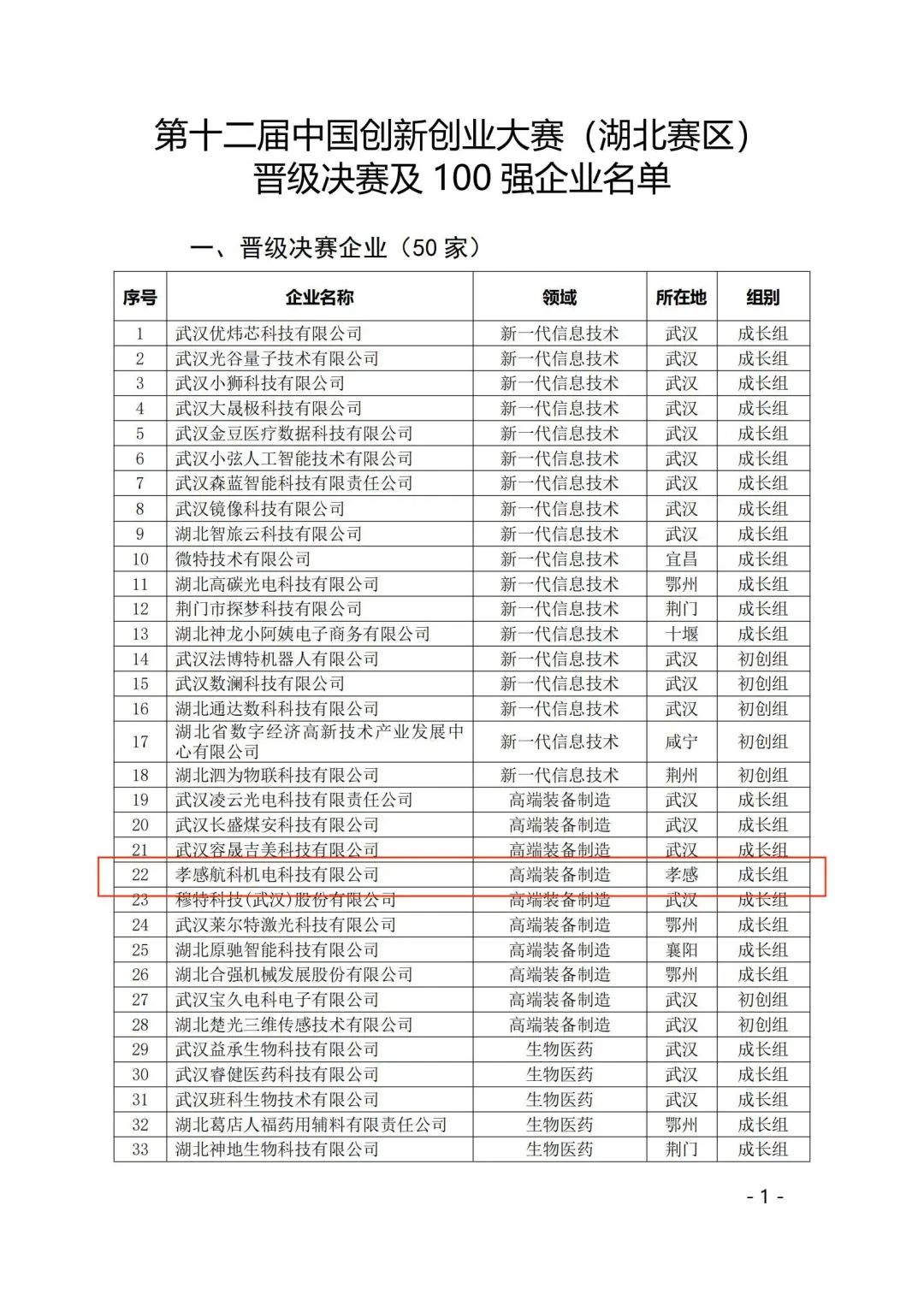 8月14日,中央部委举办的顶级高含金量创新创业大赛——第十二届中国创新创业大赛(湖北赛区)决赛名单出炉。卓越产业园推荐、辅导企业——孝感航科机电科技有限公司经逐级筛选,层层晋级,作为孝感地区唯一一家企业成功入围湖北省决赛,并荣获“湖北科创大赛100强”企业荣誉称号。