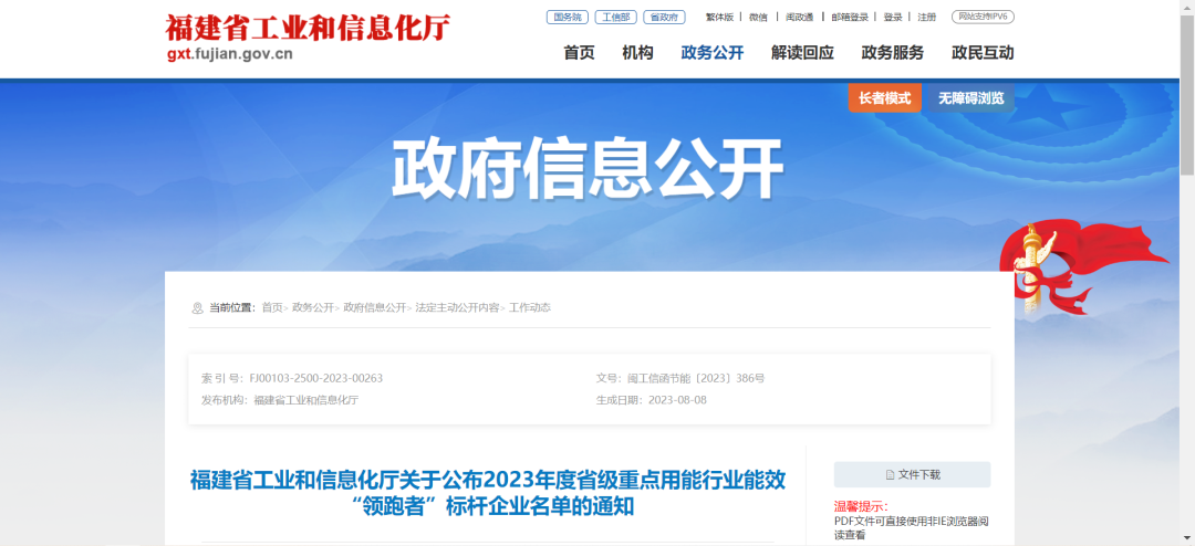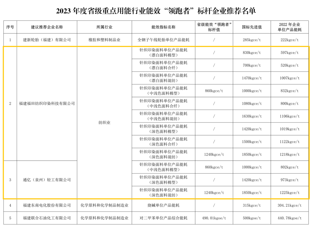 根据《关于组织开展2023年度省级重点用能行业能效“领跑者”标杆企业遴选工作的通知》(闽工信函节能〔2023〕204号),经企业自愿申报、各地推荐、专家评审和公示,确定5家企业为2023年度省级重点用能行业“能效领跑者”标杆企业。