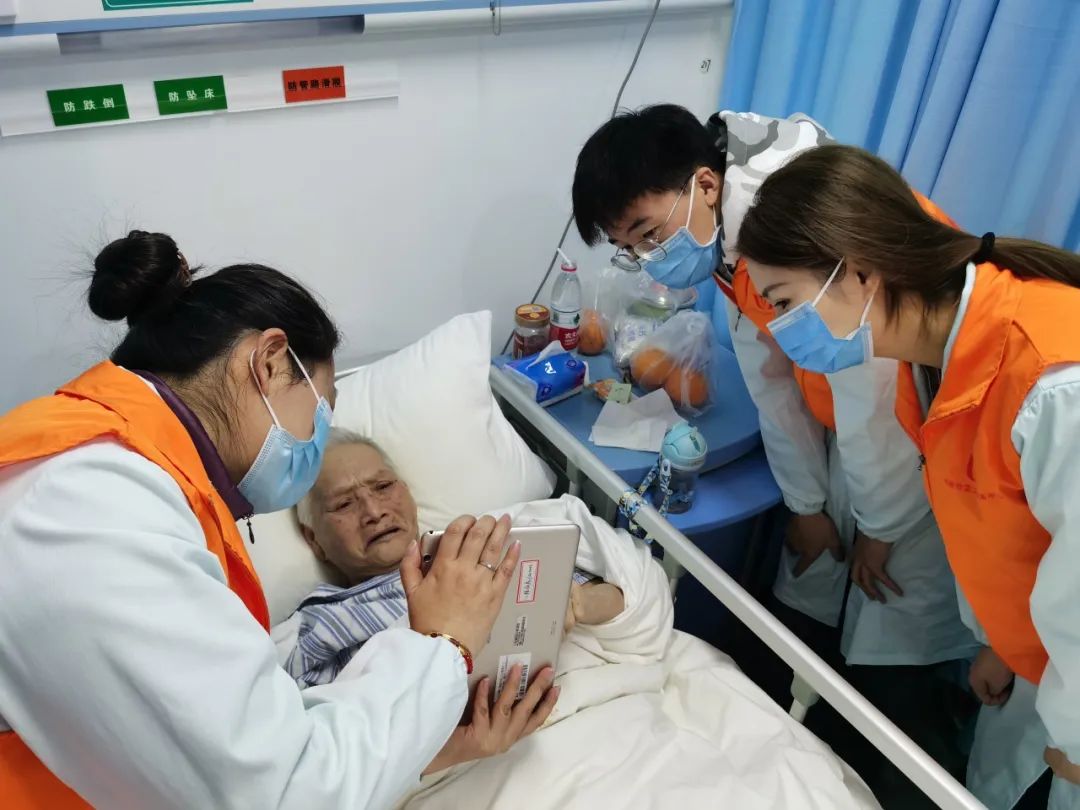 “祁·善”志愿服务队始终将关爱老人、善待老人、尊敬老人体现在老年病房的日常照护之中:定期为老人修剪头发、每年开展“九九重阳,敬老爱老”系列活动,每周固定时间开展“暖屏牵手,温暖不缺席”家属线上探视活动、为百岁老人准备特殊生日宴……努力打造“暖入患者心底的温度”。