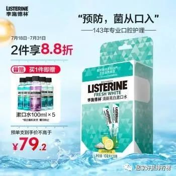 品牌:李施德林是一款拥有130多年历史的漱口水品牌,自1879年创立以来,李施德林一直坚持以“全口腔清洁”作为品牌的理念,致力于满足消费者清洁口腔的需求。其四种植物精油配方能够有效减少牙菌斑、健康牙龈、预防蛀牙、保持持久的口气清新。