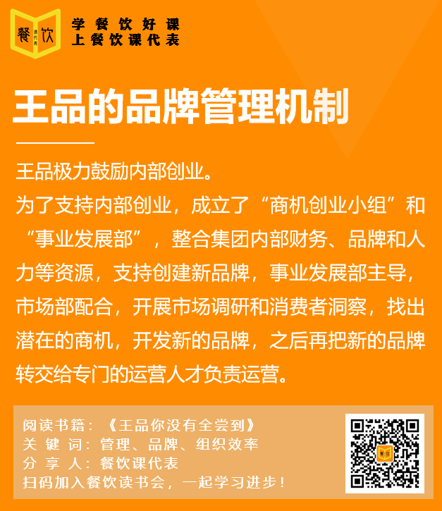 王品为了支持内部创业,成立了“商机创业小组”和“事业发展部”,整合集团内部财务、品牌和人力等资源,支持创建新品牌,事业发展部主导,市场部配合,开展市场调研和消费者洞察,找出潜在的商机,开发新的品牌,之后再把新的品牌转交给专门的运营人才负责运营。在王品,事业发展部、市场部和事业处负责人构成了一个铁三角,事业发展部负责寻找商机,市场部负责完善品牌的定位、营销战略,事业处负责人负责品牌的运营。
