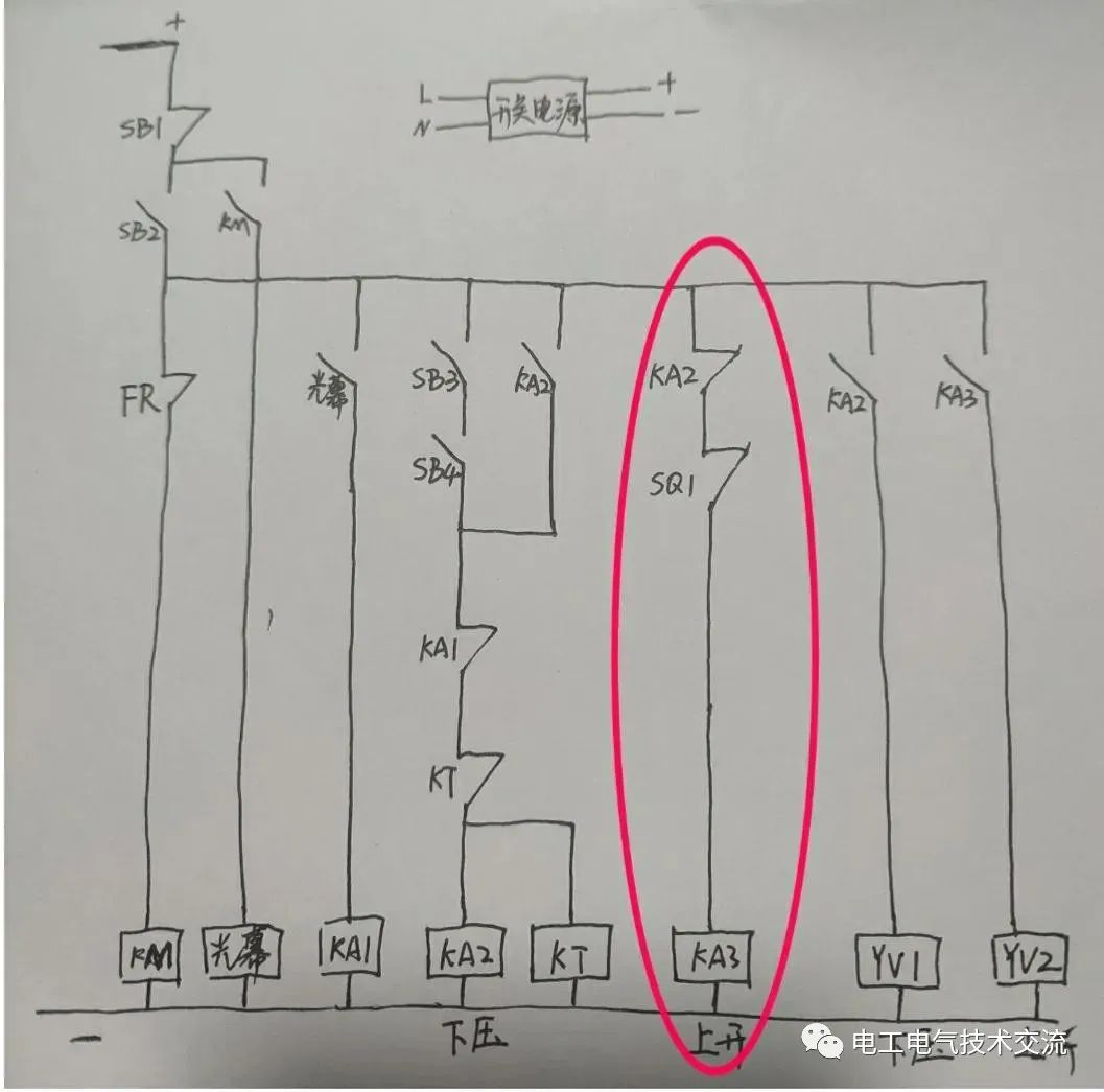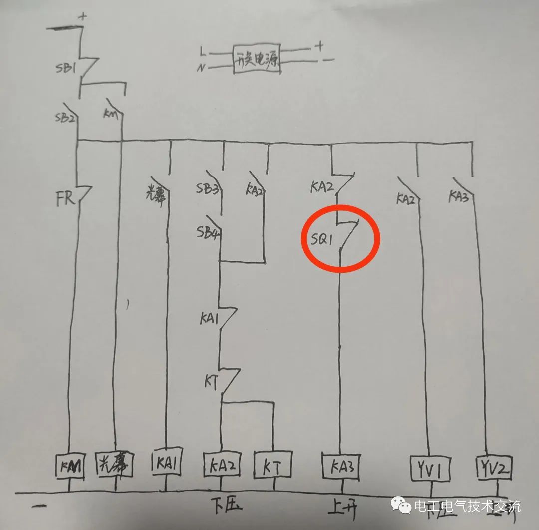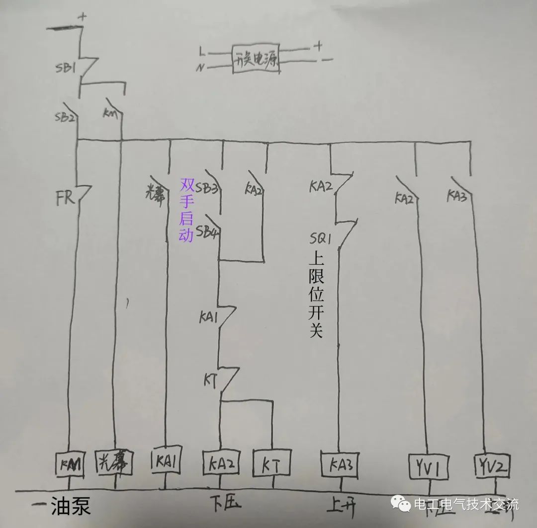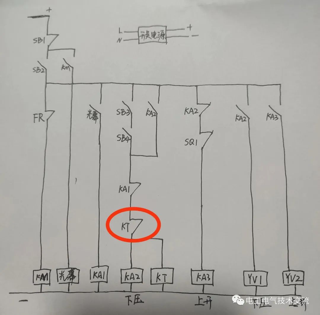 不在原位自动上升,双手按住SB3、SB4,KA2通电,电磁阀YV1通电,液压机下压。KT设置下压的时间,根据工艺需要设置相应的时间,时间到时,KA2断电,KA3通电,电磁阀YV2通电,液压机上升。液压机上升的过程中,触碰上限位开关时,KA3断电,上升停止。液压机在下压的过程中,如不注意手伸入时,油压机立即上升。手伸入时,光幕常开触点闭合KA1通电。KA2断电,KA3通电,液压机上升。下压电路控制的替代品