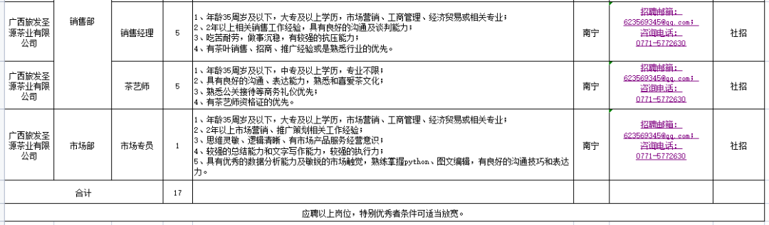 广西旅发圣源茶业有限公司公开招聘17名员工(详见附件1)。