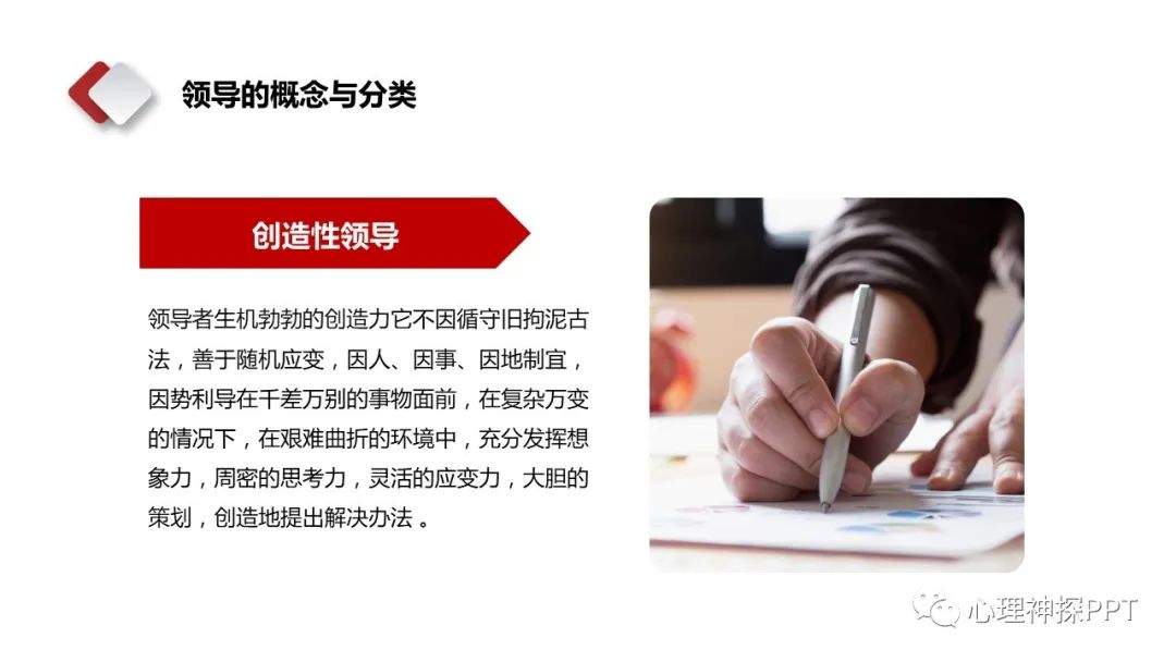 领导者生机勃勃的创造力它不因循守旧拘泥古法,善于随机应变,因人、因事、因地制宜,因势利导在千差万别的事物面前,在复杂万变的情况下,在艰难曲折的环境中,充分发挥想象力,周密的思考力,灵活的应变力,大胆的策划,创造地提出解决办法 。