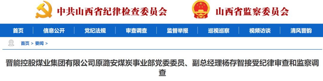 今日,山西省纪委监委官网发布晋能控股煤业集团有限公司原潞安煤炭事业部党委委员、副总经理杨存智接受纪律审查和监察调查信息。