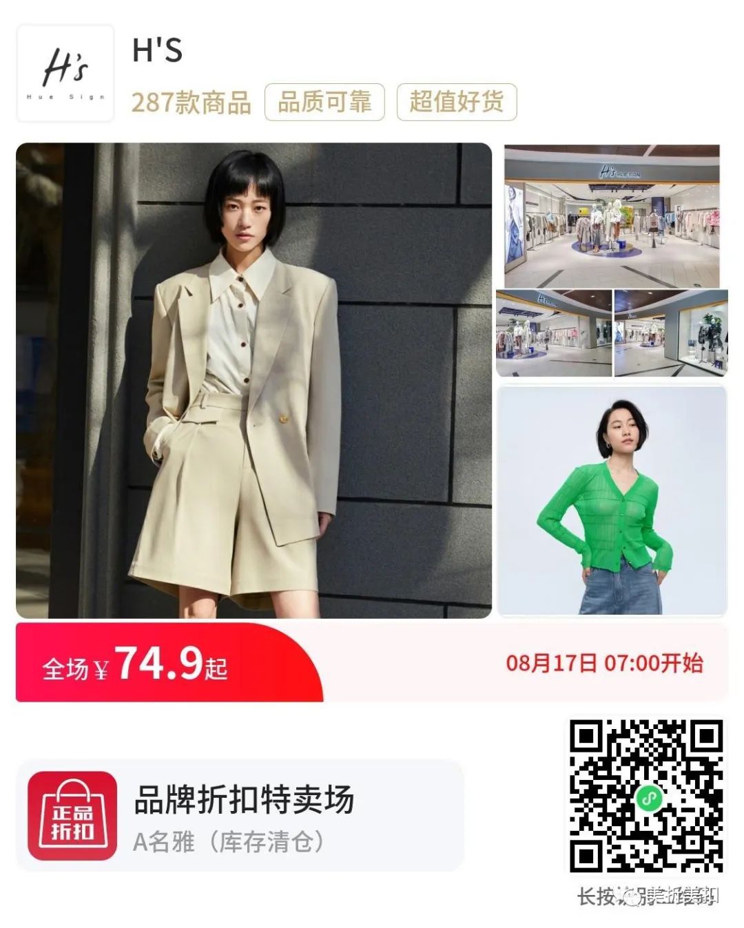? H'S 是成立于 2009 年的设计师品牌,品牌发展至今,在全国一二线城市核心商圈Shoppingmall 及百货拥有 200 多家门店!!