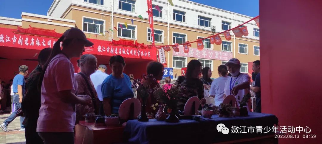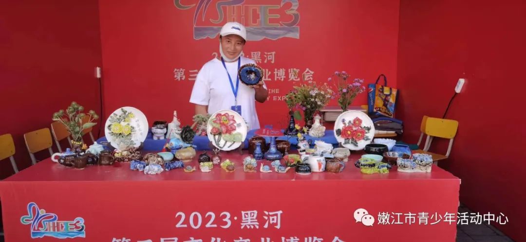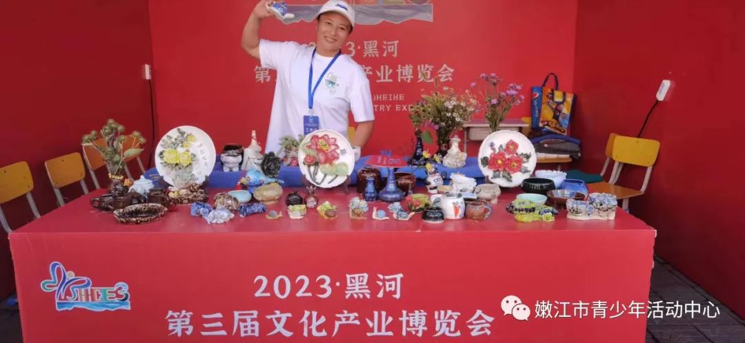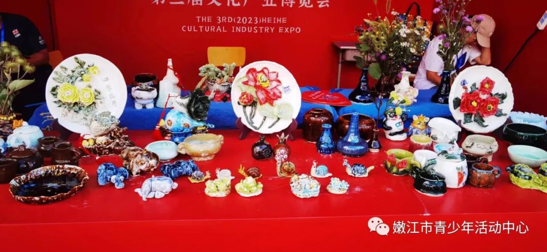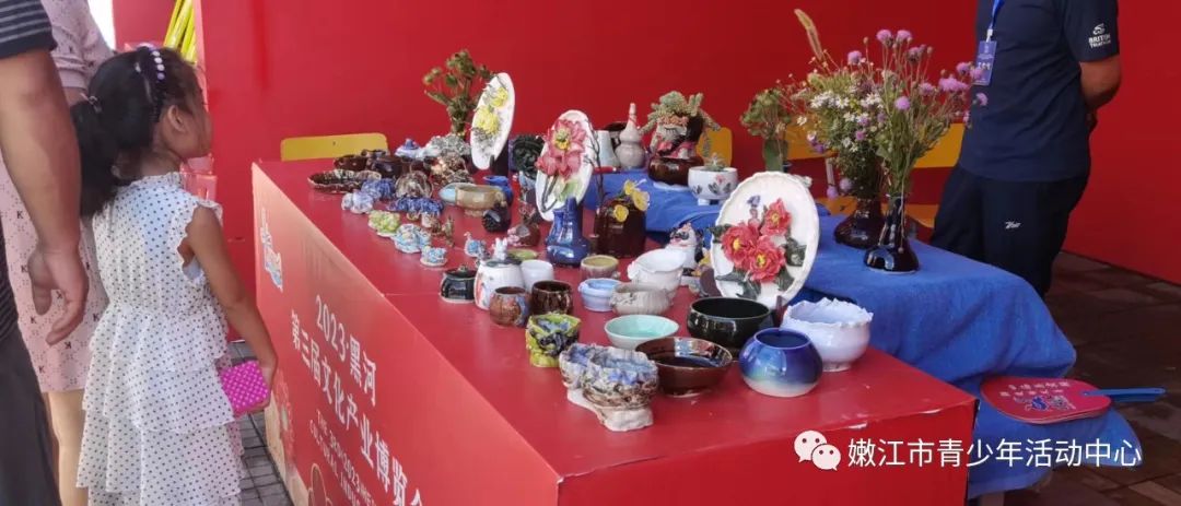 2023年8月13日黑河市第三届文化产业博览会在嫩江市步行街举办!活动共设六大文化旅游精品展供市民、游客参观体验,包括文化产业综合展示区、乡镇特色展示区、绿色产品展示区、文化互动体验区、惠民文化展示区、特色美食品尝区,展出内容包含非遗产品、书法字画、文创产品、传统美食等全方位展示亮眼多彩的黑河文化风貌。满足人民文化需求,丰富人民文化生活,提升大众审美素养。青少年活动中心陶艺作品琳琅满目的展在了文化互动体验区。