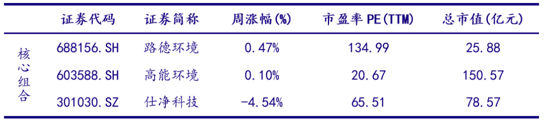 建议关注:仕净科技(301030)、盛剑环境(603324)、国林科技(300786)、景津装备(603279)、美埃科技(688376)、高能环境(603588)、路德环境(688156)、山高环能(000803)、伟明环保(603568)、久吾高科(300631)、赛恩斯(688480)、瀚蓝环境(600323)、清新环境(002573)。