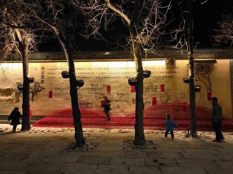 遍布北庄村内的旅游打卡点,豆腐房门前的豆瓣形状座椅、村委楼前的活动小广场、微笑打卡点、红色秋千、古井记忆等都是村庄的景观。