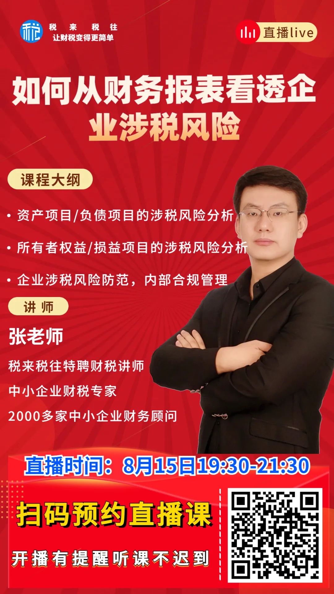 就在今天,一个千载难逢的机会给到你? 而且还是完全免费!税来税往特聘财税讲师、2000多家中小企业财税顾问的张乐新老师将为大家带来线上直播课——《如何从财务报表看透企业涉税风险》。张乐新老师结合95%学员的3大痛点难题,苦苦磨课180+小时,从全方位角度,打造了这款精品课程,对“财报分析”进行系统梳理和解答!今天,0元完全免费给到你!从此,财务报表分析你也可以!